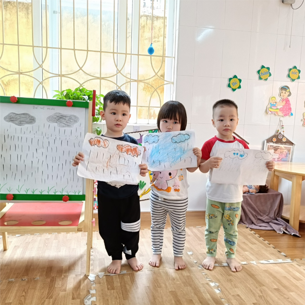 Hoạt động tạo hình cho trẻ 24 - 36 tháng có ý nghĩa vô cùng quan trọng trong việc giáo dục thẩm mỹ cho trẻ nhà trẻ. Đặc biệt hoạt động tạo hình giúp phát triển cảm giác, tri giác, làm sâu sắc thêm khả năng thẩm mỹ và mở ra tiềm năng sáng tạo cho mỗi đứa trẻ. Từ những buổi ban đầu bỡ ngỡ, bàn tay nhỏ xíu còn vụng về giờ các bé đã khéo léo hơn rất nhiều rồi. Hôm nay lớp 2 tuổi tổ chức giờ học : “Bé vẽ mưa”. Thông qua giờ học giúp bé biết cách cầm bút vẽ những nét đứt thẳng xiên dài, xiên ngắn từ trên xuống dưới tạo thành những hạt mưa rơi. Thông qua tiết học giáo dục trẻ biết mặc áo mưa, che ô khi gặp trời mưa.